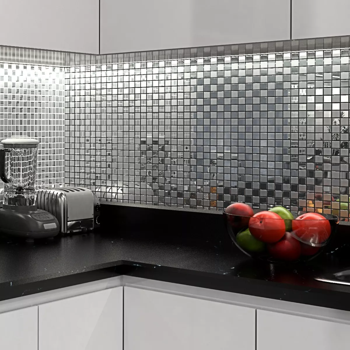 Los revestimientos de acero inoxidable de Indra Inox son una opción para revestir baños y cocinas o usarlos como guardas. La calidad del acero es 304, uno de los más resistentes. Vienen en mallas de plástico para que los puedas cortar fácilmente.