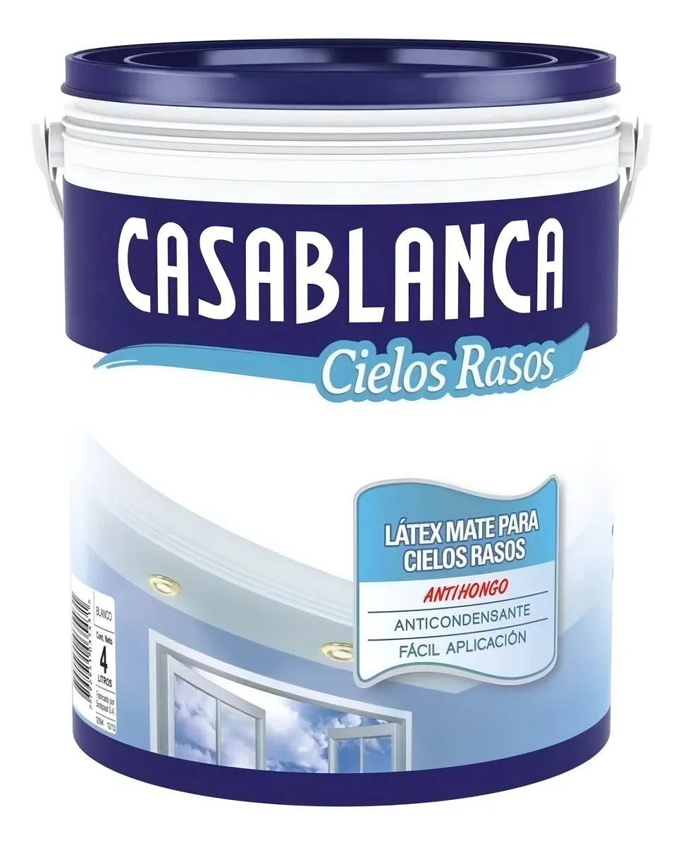 Antihongo Anticondensante. Fácil aplicación. Recubrimiento que disminuye la formación de hongos. Previene el goteo por condensación de vapor de agua, evitando la formación de manchas de humedad. Indicado para proteger y decorar cielorrasos en general, especialmente para baños y cocinas. Se aplica con mínimo salpicado y buena nivelación. Apto para ser utilizado sobre yeso, revoque, fibrocemento, paneles acústicos, etc. Usos: Indicado para proteger y decorar cielorrasos en general, y para baños y cocinas en particular revoque, fibrocemento, paneles acústicos, hardboard, etc. Tratamiento previo: La superficie a pintar debe estar limpia, seca, sin grasa, polvo y hongos. De existir grasitud, tratar con agua y detergente. Eliminar los hongos con solución en partes iguales de lavandina y agua, luego enjuagar y dejar secar. Superficies nuevas o con pintura en buen estado, serán acondicionadas con Casablanca Sellador Fijador, diluyendo 1 parte de producto con 3 partes de agua. En superficies flojas, pulverulentas o en mal estado, fijar con sellador al aguarrás. En yeso nuevo, dejar secar 30 días. Imperfecciones menores deben corregirse con Casablanca Enduido Interior, posteriormente volver a sellar/fijar sobre el enduído. Aplicación: Mezclar bien el producto hasta su perfecta homogeneización. Aplicar 2 o 3 manos tal cual se presenta en el envase, o si se considera necesario diluir con agua hasta un 5%. Aguardar un tiempo de secado entre manos de 4 horas. Se puede aplicar con pincel, rodillo o soplete (airless). Durante la aplicación y secado la temperatura ambiente debe ser mayor que 5° C.