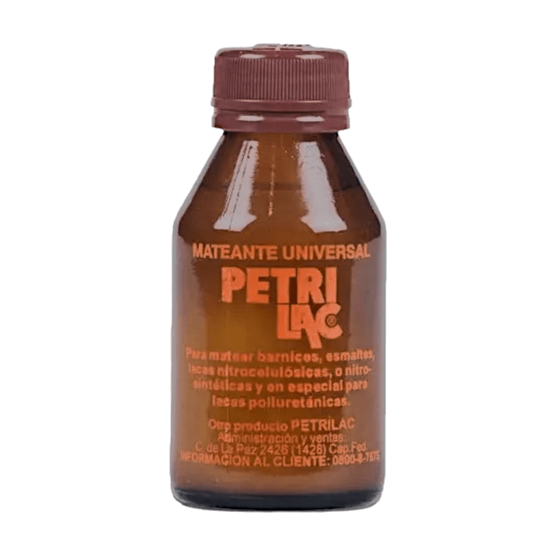 El MATEANTE UNIVERSAL PETRILAC® es una suspensión de ceras y sílices en solventes, para mezclar en lacas barnices, esmaltes u otras pinturas cubrientes, para atenuar el brillo o dar una terminación semi mate en las maderas en interiores o en exteriores. Totalmente transparente, no oculta la veta. Posee buena resistencia a los rayos UV y a agentes climáticos.