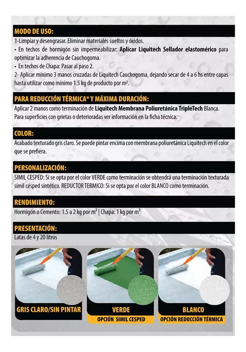 CAUCHOGOMA es un IMPERMEABILIZANTE de alto espesor compuesto por polímeros de caucho microtriturado a partir del reciclado de neumáticos y formulado a base de resinas acrílicas y poliuretano.