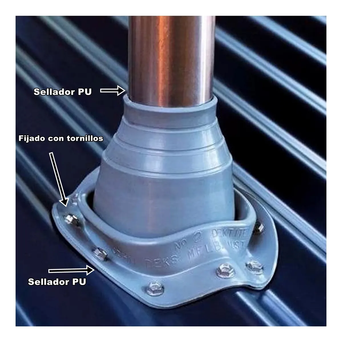 Sello hermético y elástico para salidas de ventilaciones y paso de cañerías en cubiertas metálicas, apto para intemperie y condiciones de temperaturas elevadas, con una base flexible y resistente que se la adapta a diferentes formas de chapa.