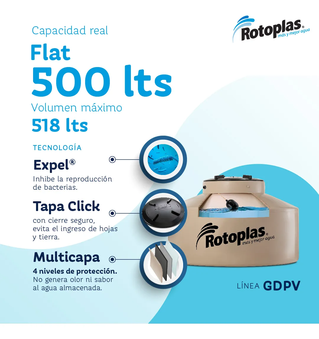 Su diseño moderno y estilizado se adapta fácilmente a cualquier entorno. No esperes más y asegura el abastecimiento de agua para tu hogar o negocio con este práctico y resistente tanque de agua Rotoplas Flat Chato.