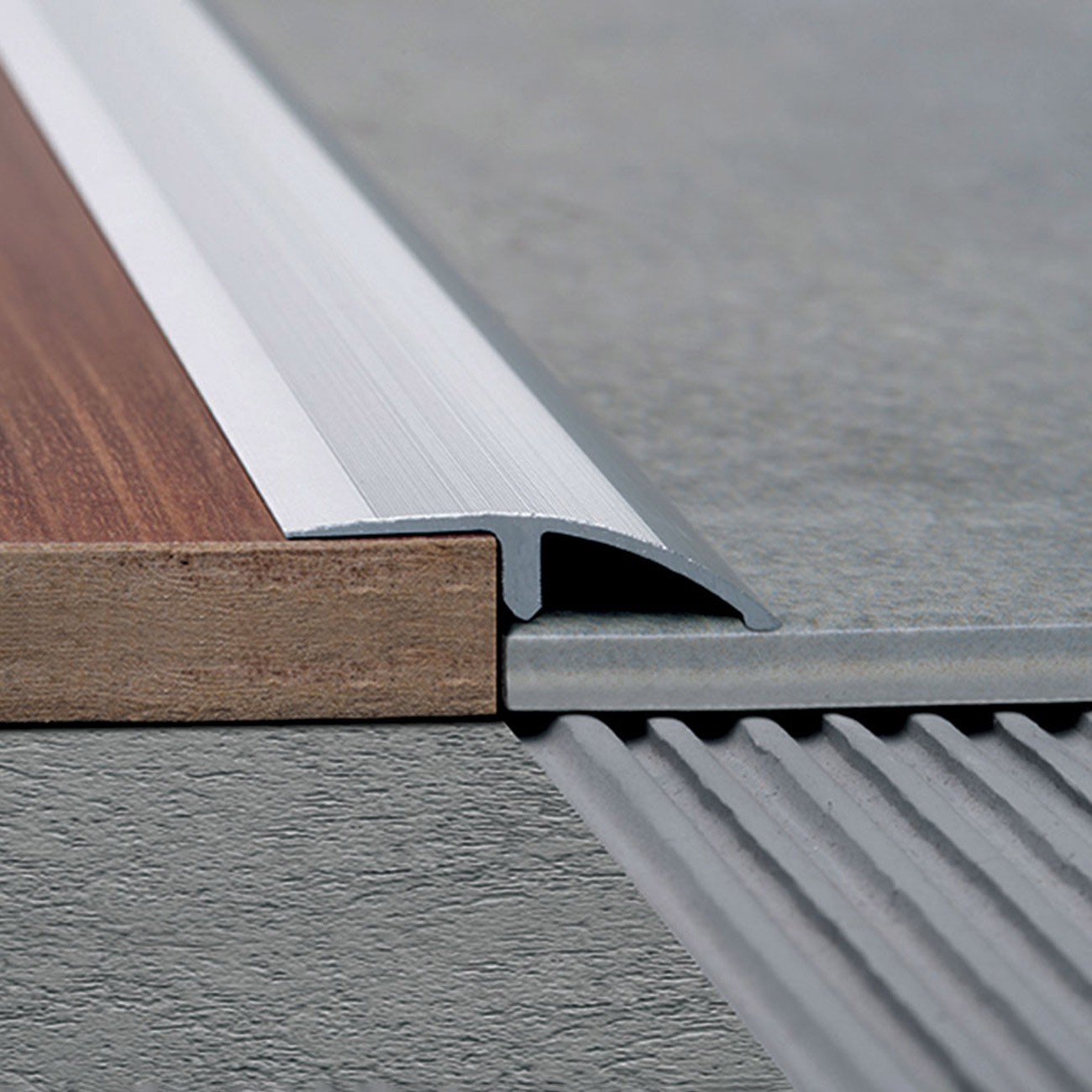 Perfil de aluminio curvo transicional para pisos de diferentes alturas. Cubre imperfecciones debido a los cortes o astillado de los materiales.
